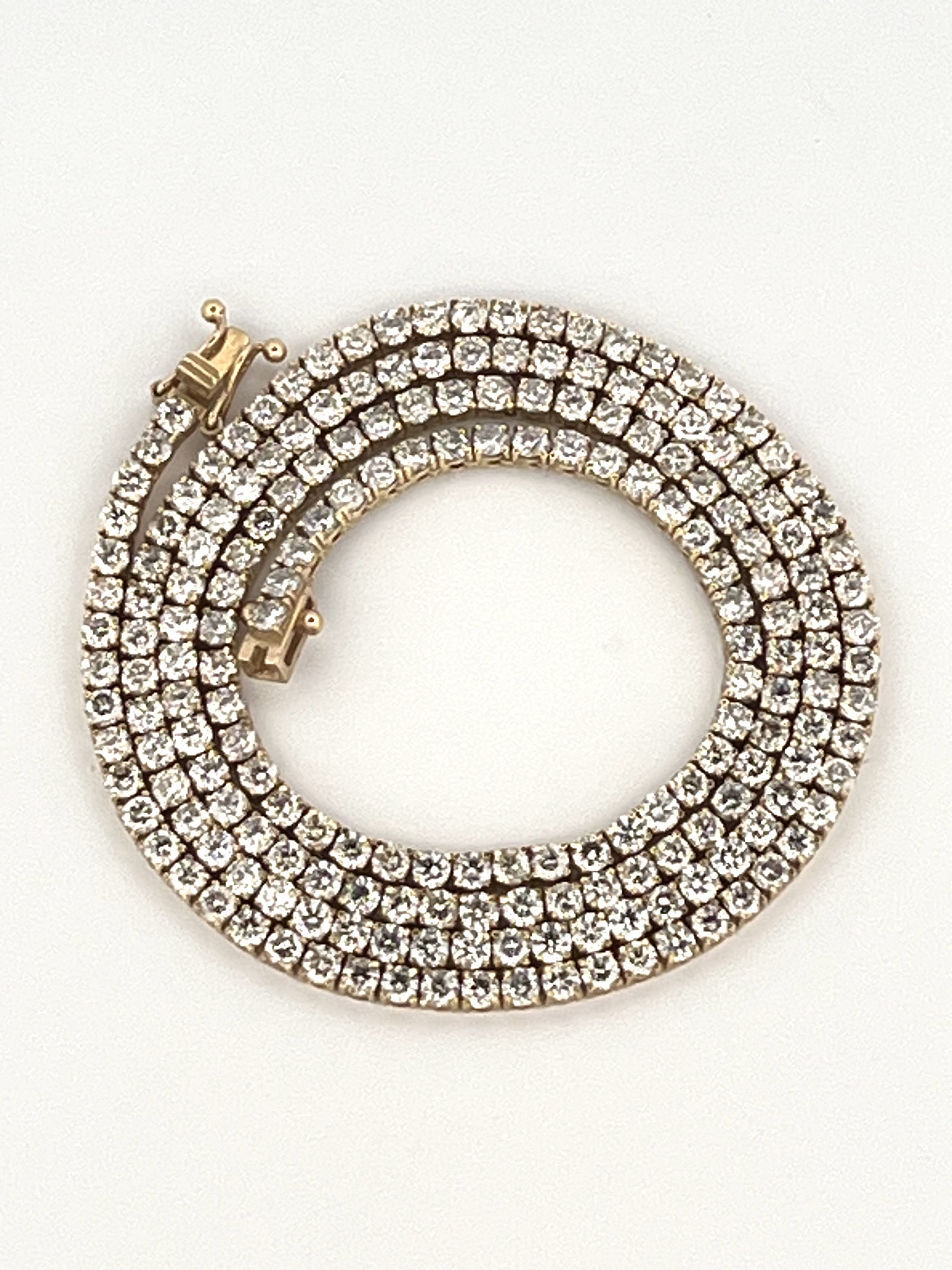 An extremely elegant 22 inch tennis necklace handmade in 14kt yellow gold featuring 17.26 carats of natural round brilliant white diamonds (G-H, SI1-SI2). Easily capable of being dressed up or down due to its longer length.