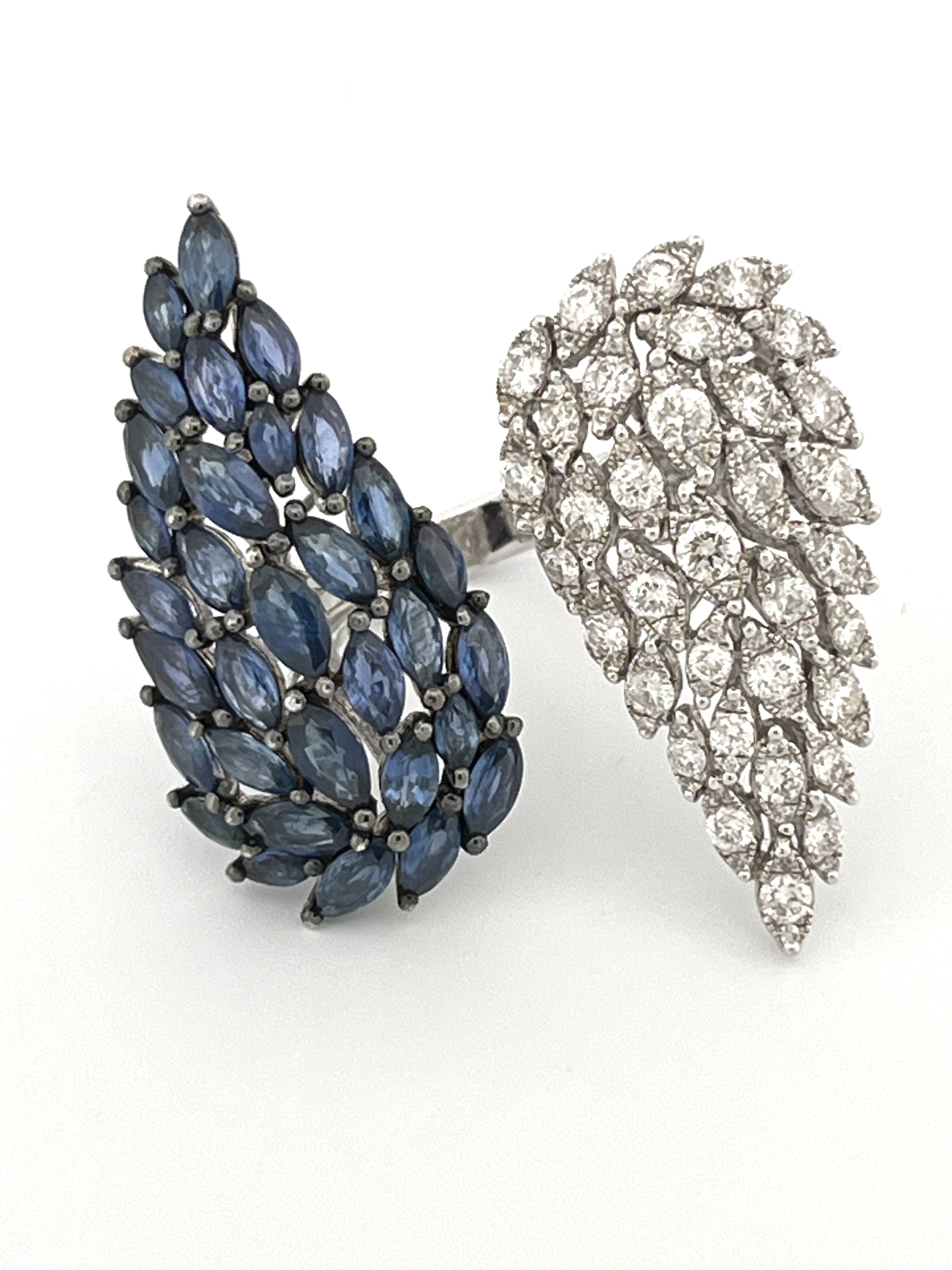 An artisanal and highly decorative cocktail ring handmade in 18kt white gold featuring 4.20 carats of natural marquise-cut blue sapphires and 1.70 carats of natural round brilliant white diamonds (F-G, VS1-SI1). Ring size 6.5.