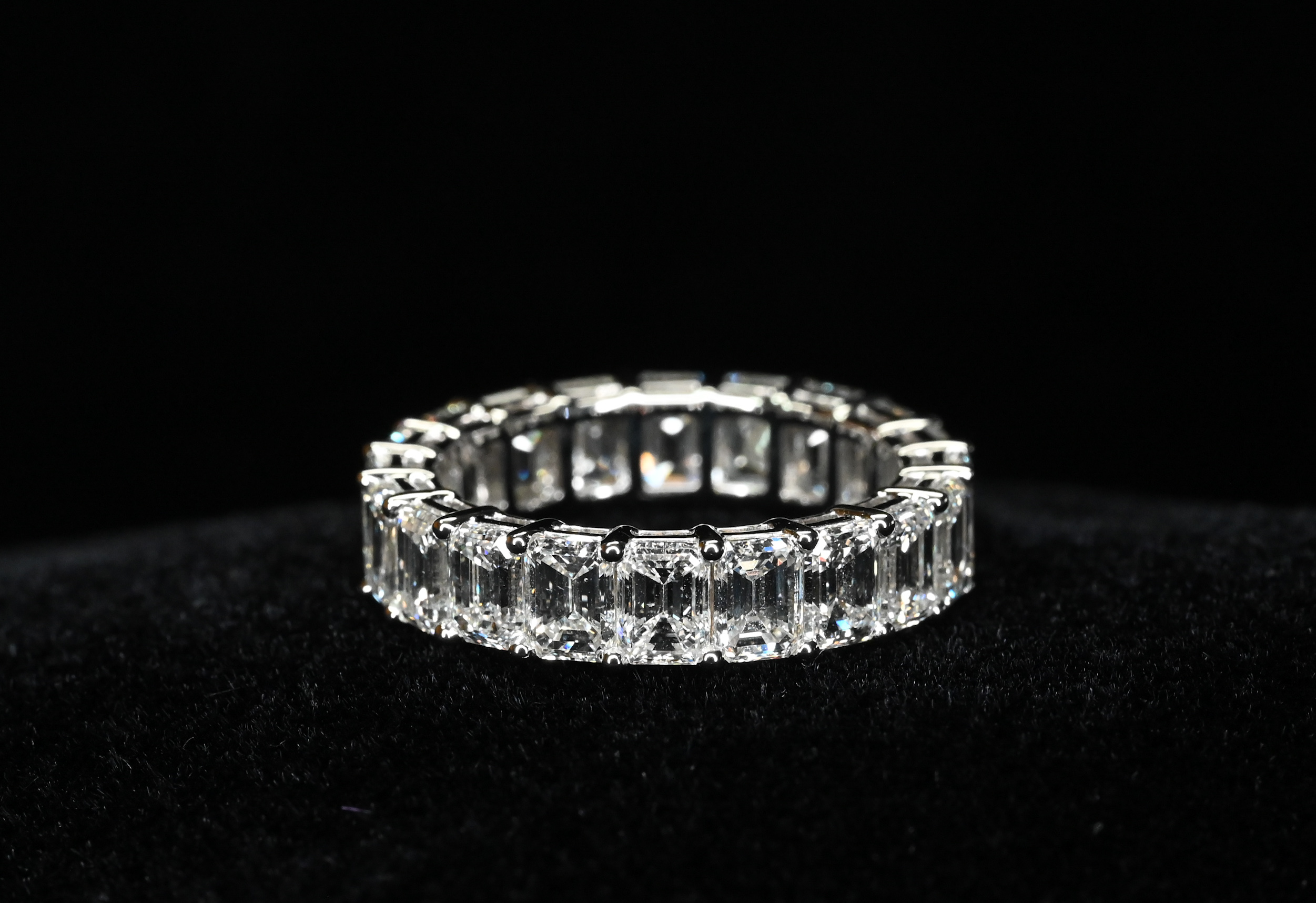 This eternity band is meticulously crafted in 18kt white gold, weighing 3.9 grams for a refined yet substantial feel. The design showcases 20 emerald-cut diamonds totaling 6.49 carats, each hand-selected for their exceptional G color and VS clarity. Set in a seamless, continuous row, the elongated facets of the emerald cuts create a captivating play of light with understated elegance. Ring size 6.5.